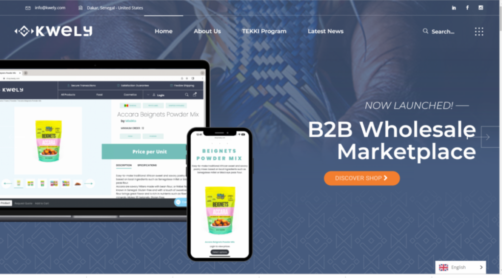 DAKAR, Senegal, 14 decembre 2022 -/African Media Agency(AMA)/- Kwely Inc. a annoncé aujourd’hui le lancement de sa boutique en ligne B2B révolutionnaire pour offrir aux producteurs et fabricants africains une fenêtre mondiale pour vendre leurs produits à grande échelle. Les acheteurs internationaux peuvent désormais s’approvisionner en produits de haute qualité, uniques et fabriqués localement à travers le continent. En commençant par des produits fabriqués au Sénégal allant de l’alimentation, du bien-être, des cheveux et de la peau, la plateforme propose des produits qui ont été fabriqués, testés et emballés selon des normes internationales telles que les exigences d’emballage de la Food & Drug Administration (FDA) des États-Unis.