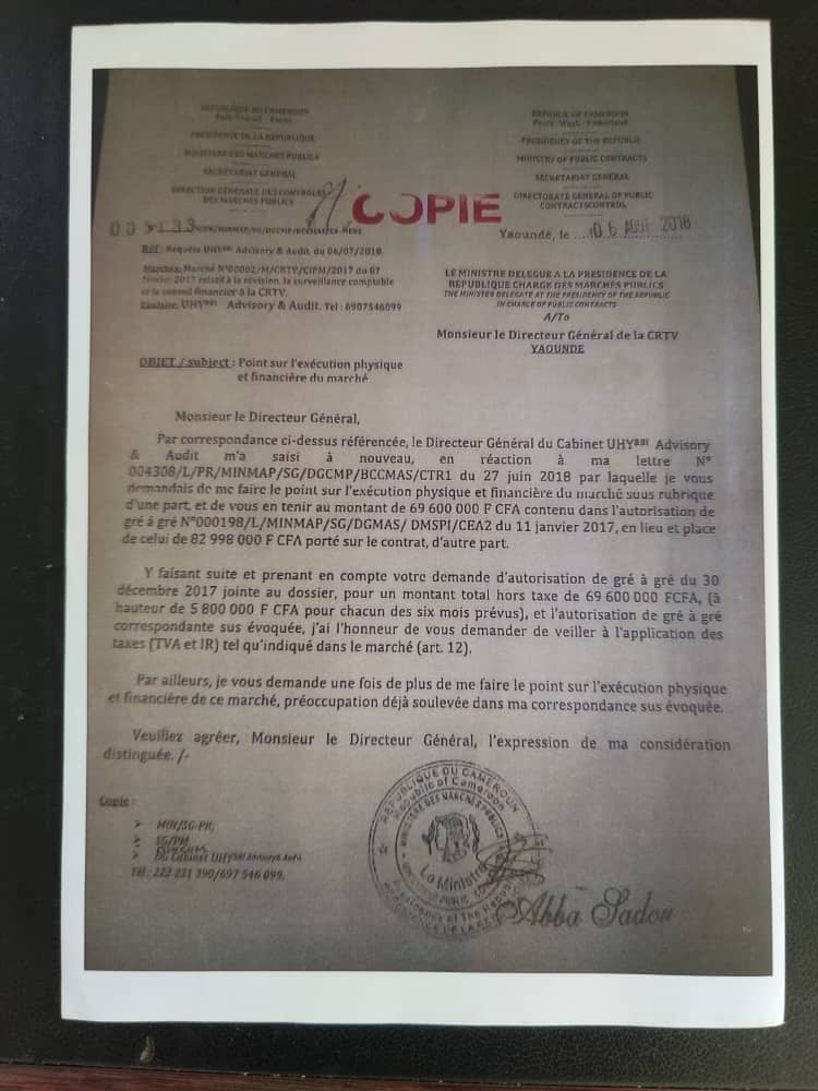 Par un courrier déposé le 3 janvier 2017 au ministère des Marchés publics, le directeur général de la Crtv sollicite du ministre délégué à la présidence de la République chargé des Marchés publics, une autorisation de gré à gré en conformité avec les dispositions combinées des articles 29 (a) et 127 (1) du Code des marchés publics de 2004, sollicitant de ce fait que cette autorisation soit accordée au cabinet BBI Advisory & Audit.