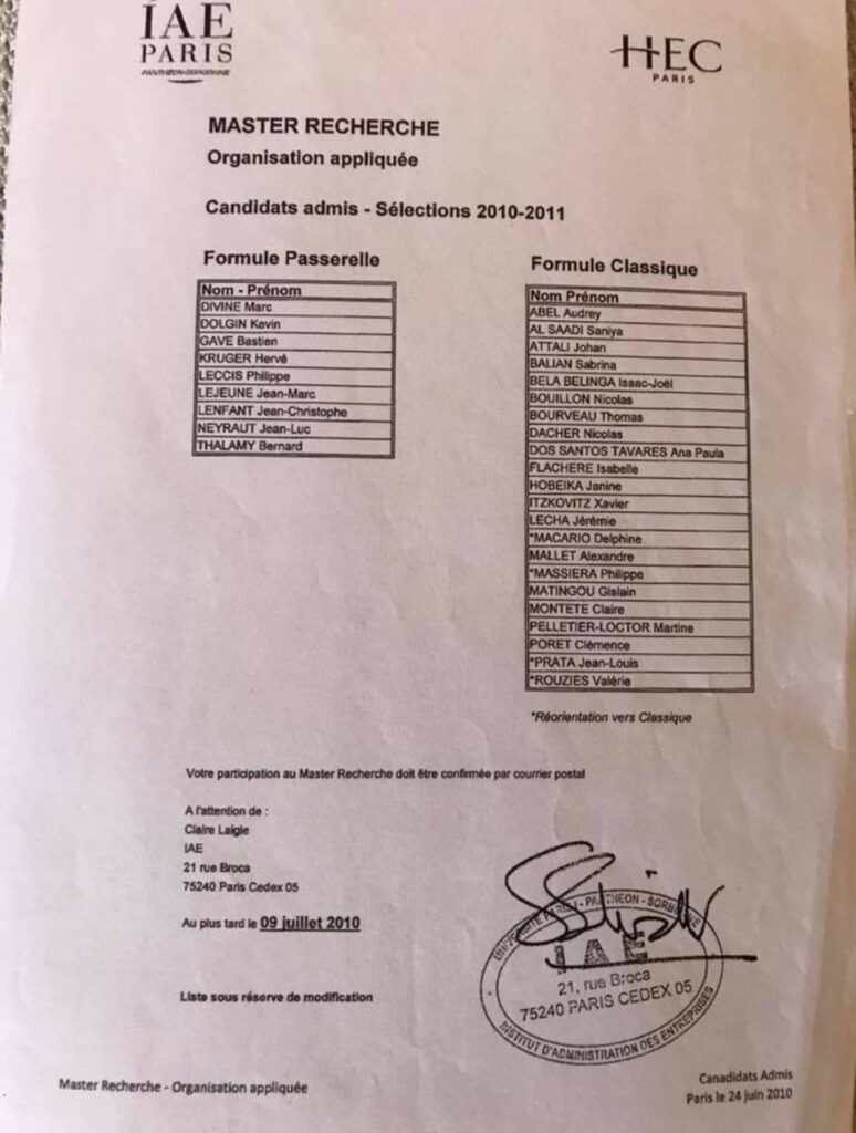Pour ce qui est du Master à HEC de Paris, sur la base d’un concours hautement discuté, après étude de dossier et entretien devant un jury constitué des enseignants de HEC de Paris et de l’Université paris 1 Panthéon Sorbonne, Isaac Joël Bela Belinga avait été admis au Master Management et Stratégie des Organisations (parcours recherche appliquée avec HEC de Paris). Ce Master qui est délivré par l’Université Paris 1 Panthéon Sorbonne est co-habilité par l’Université Paris 1 Sorbonne et l’Ecole des Hautes Etudes Commerciales de Paris (HEC de Paris).