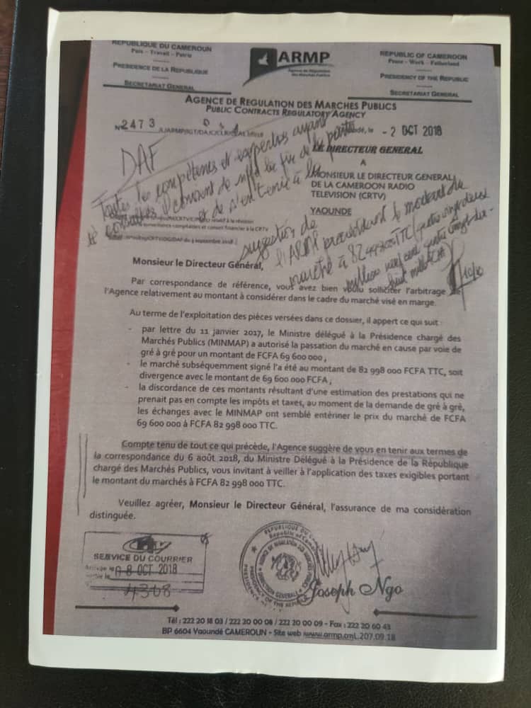 Seulement, Charles Ndongo ne s’en tient pas qu’à cela. Afin d’être confortable dans ses décisions de gestion, après avoir reçu la correspondance du ministre Délégué à la présidence de la République chargé des marchés publics, le directeur général de la Crtv saisit à nouveau le régulateur des marchés publics, l’Agence de Régularisation des Marchés publics, à l’effet de procéder à un arbitrage sur le montant du marché à retenir au regard de la position du ministre des Marchés publics. Par sa correspondance du 2 octobre 2018, le directeur général de l’Armp confirme le montant du marché à Fcfa 82 998 000 Fcfa TTC, demande ainsi au directeur général de la Crtv de s’en tenir à la position formulée par le Ministre Délégué à la présidence de la République chargé des Marchés publics.