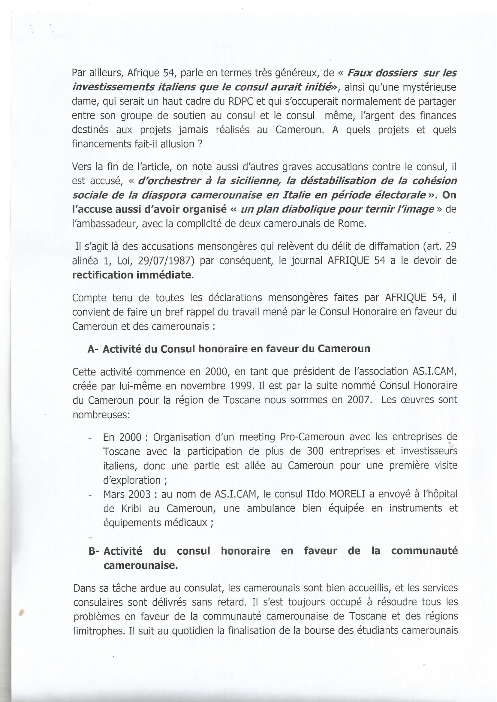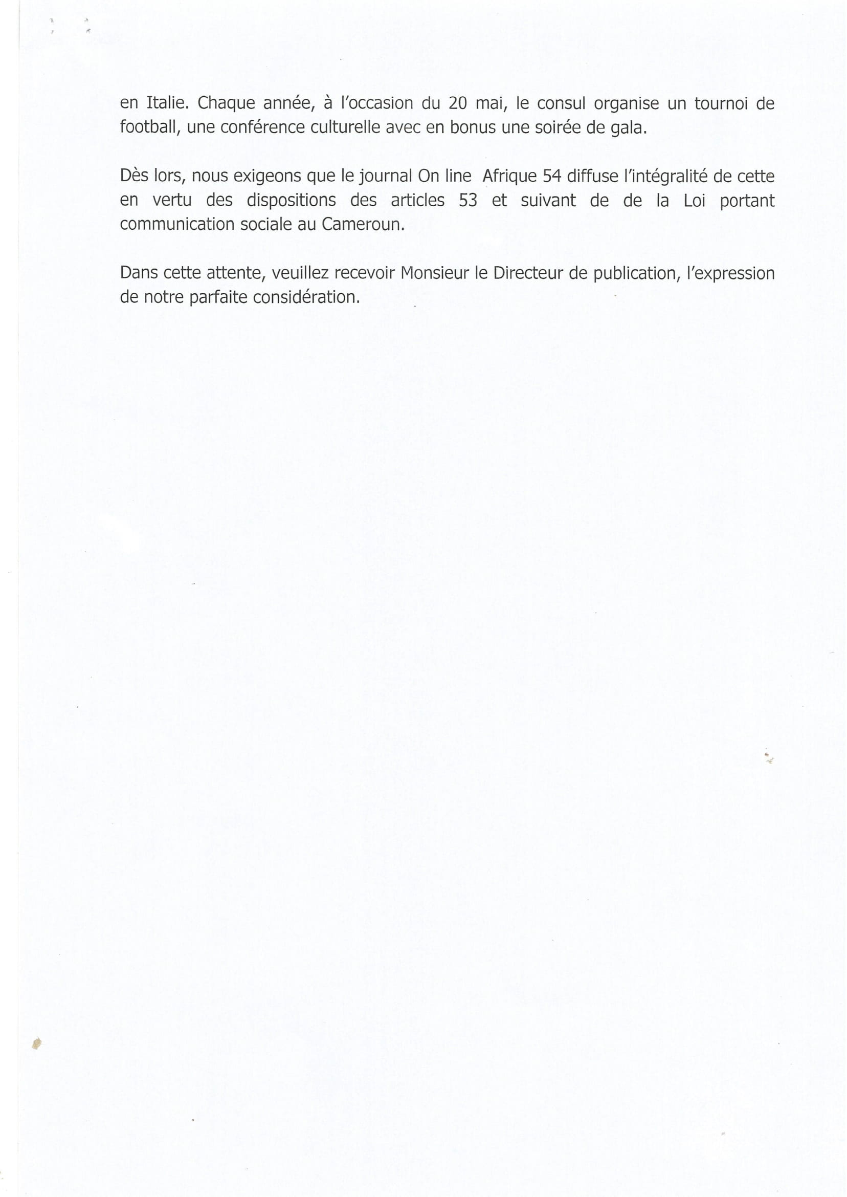 « 1 .Nous nous rendons compte que vous avez relayé des informations portant atteinte à l’honneur et à la considération du consul honoraire de Florence, à travers une accusation directe faisant de lui « Celui qui tire les ficelles de l’ombre », «  la source du problème », «  le problème viendrait de Florence ou une mafia bien installée et constituée de camerounais et d’italiens  voudrait que soit maintenue à son poste le consul honoraire. Une ambition que ne partagerait pas Dominique AWONO ESSAMA ».