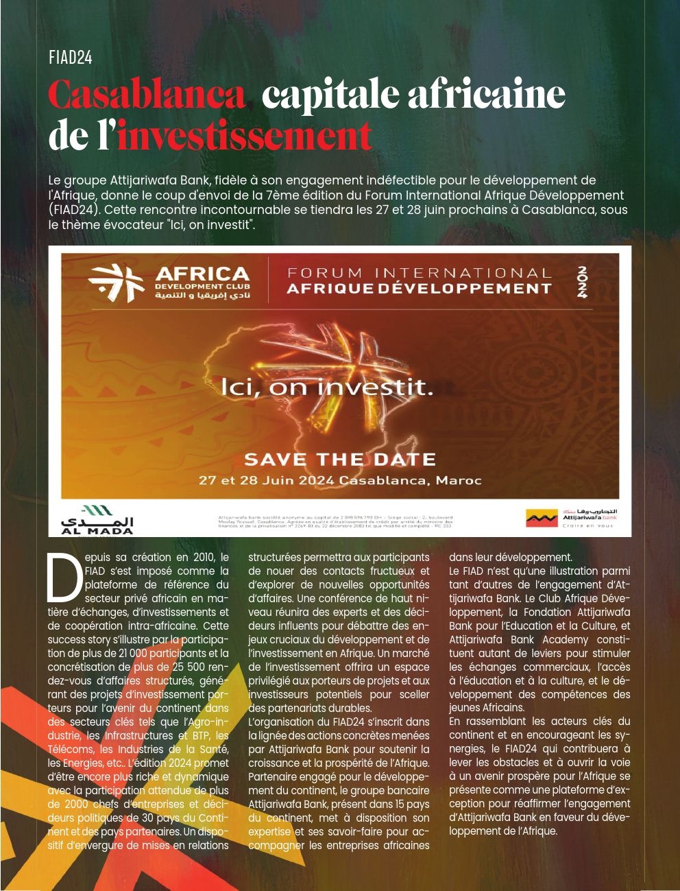 Organisé par le groupe Attijariwafa Bank à travers son Club Afrique Développement et en partenariat avec le fonds panafricain Al Mada, le FIAD 2024 est placé sous le thème : «Ici, on investit ».