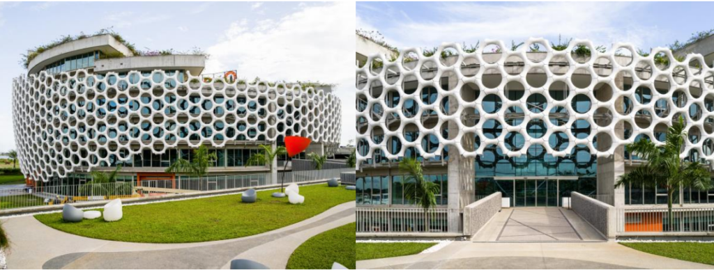 La complexité de cette façade double-courbure dont les motifs s’inspirent d’une balle de golf, a constitué un challenge de taille pour Koffi & Diabaté Architectes. Pour la modélisation et la fabrication de cette enveloppe sur-mesure, le cabinet s’est fait accompagner par l’entreprise marocaine Jet Contractors et le leader mondial de logiciels de modélisation 3D, Dassault Systèmes. L’utilisation de logiciels dernière génération a permis de créer une façade impressionnante constituée de 4000 pièces uniques qui s’imbriquent pour envelopper avec justesse la structure centrale du bâtiment.