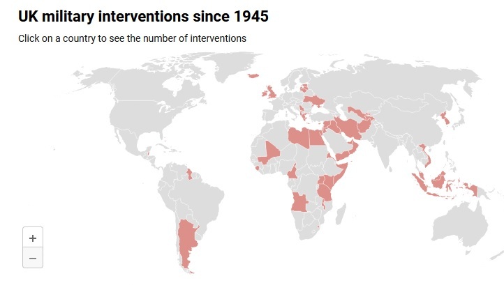 La liste des interventions est loin d’être exhaustive. Il est peu probable que l’on y trouve tous les déploiements militaires britanniques pour des combats depuis 1945. En outre, elle n’inclut pas les opérations mercenaires menées par des Britanniques, souvent soutenus par Whitehall, ni les opérations de pur renseignement visant à renverser des gouvernements.