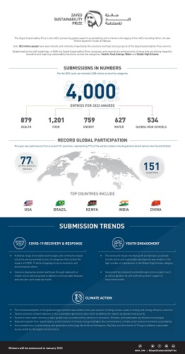 Le Prix Zayed Sustainability 2022 étend sa portée mondiale avec des soumissions records provenant de 151 pays . Le Brésil, l'Inde, le Kenya, les État