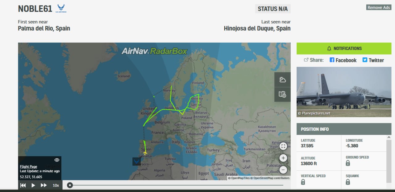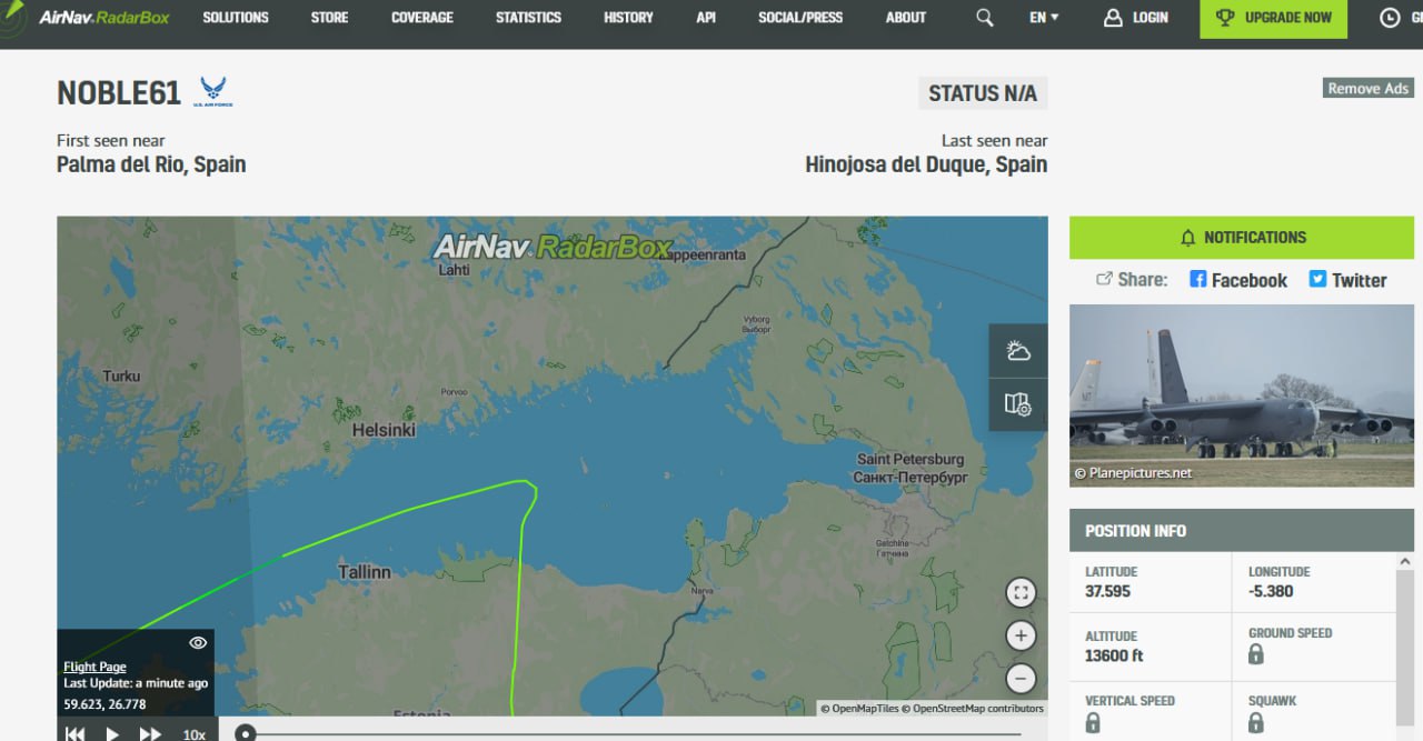 D’après les données du site RadarBox, un bombardier stratégique B-52H Stratofortres de l’US Air forces s’est approché à une distance de 200 kilomètres de Saint-Pétersbourg, la deuxième ville la plus peuplée de la Russie.